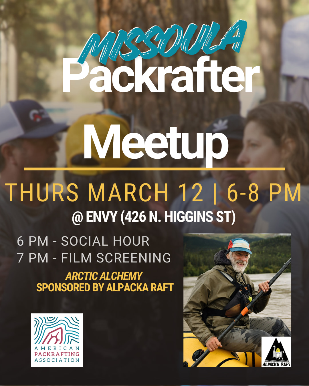 Meet-and-greet starts at 6 PM. Connect with packrafters to share your interests and trip ideas while sipping on beverages provided by Envy.