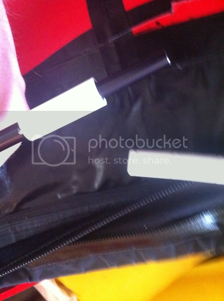 The first picture shows the pieces that make up the cockpit rim, two curved aluminum tent poles for the sides, and two PVC dowels for the bow and stern. The PVC slips in each end and the sides zipper.